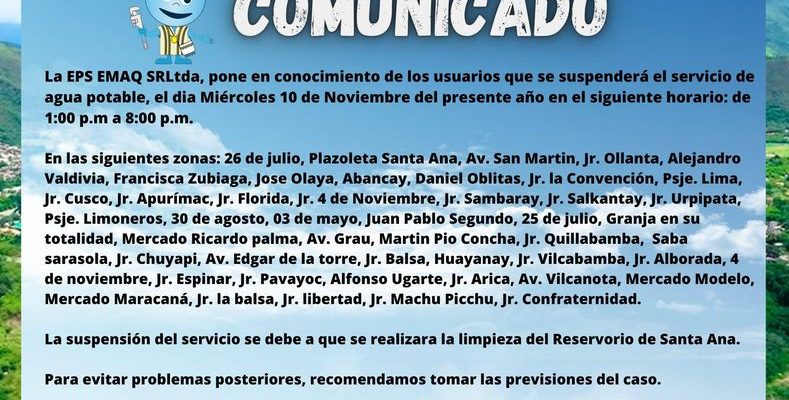 EPS EMAQ, comunica a sus usuarios que el día miércoles 10 de Noviembre del 2021, se suspenderá el servicio de agua potable de 1:00 p.m a 8:00 p.m.